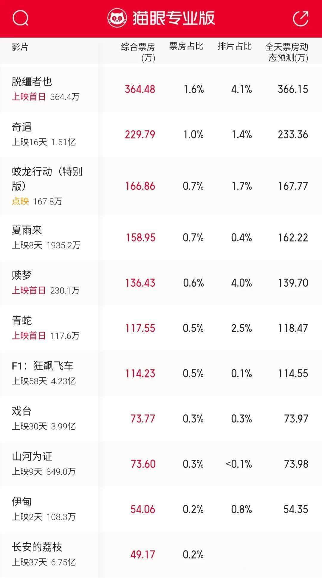 TOP8 曹保平导演,郭麒麟、齐溪、孙安可和常远主演,张本煜和林雪等主演《脱缰者也》上映首日排片18160场,观影人次10.8万,场均人次6.0人,上座率6.1%,票房占比1.6%,排片占比4.1%,首日票房364万人民币,位列单日票房榜第八名,按照猫眼平台预测最终票房为1943.2万人民币。