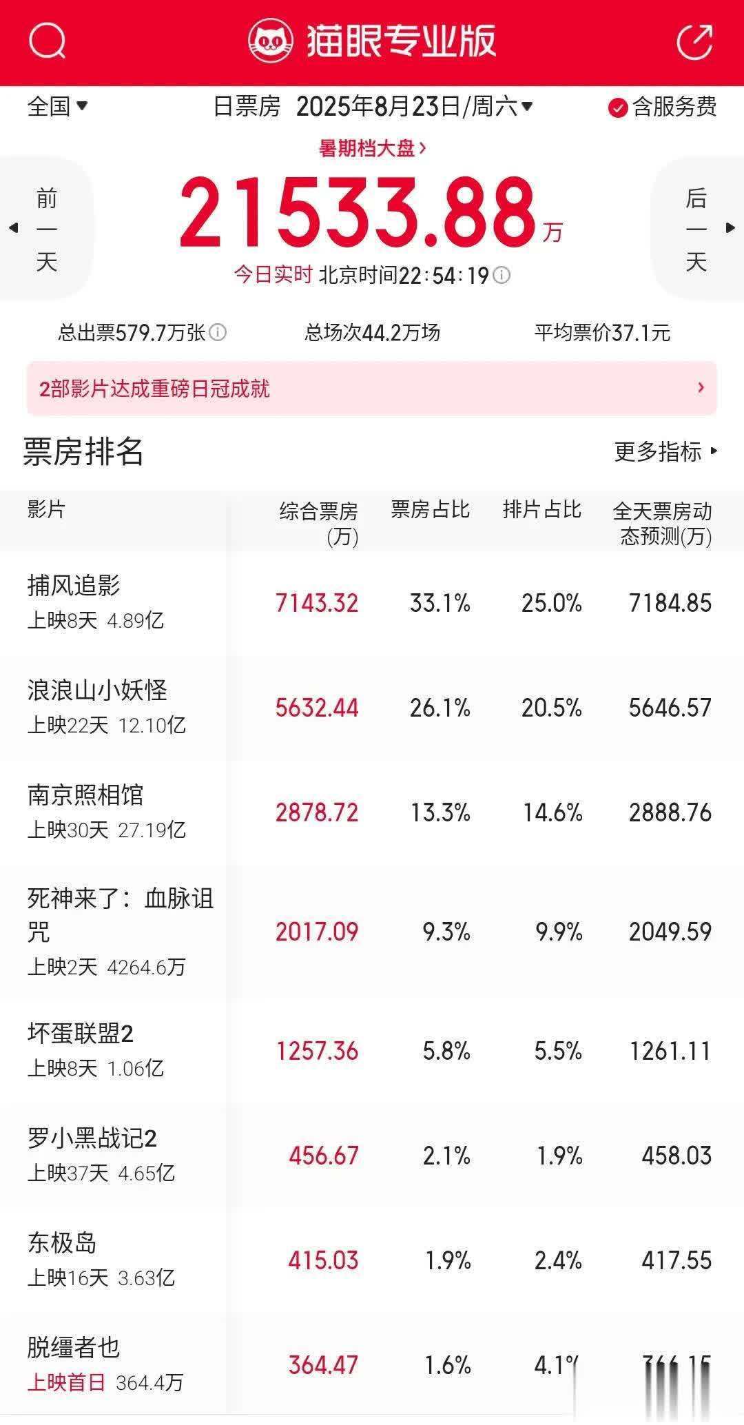 2025年8月23日(周六)截止22:54:19大盘票房 21533.88万人民币;